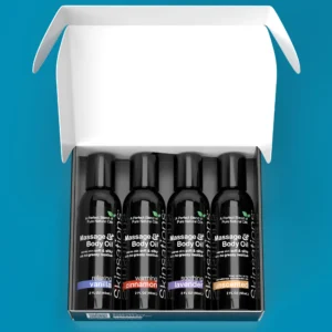 Our Massage Oil Kit includes Vanilla, Lavender, Cinnamon, and Unscented Massage Oils — each crafted with a silky, skin-loving base of Sweet Almond, Grapeseed, Golden Jojoba, and Fractionated Coconut oils.